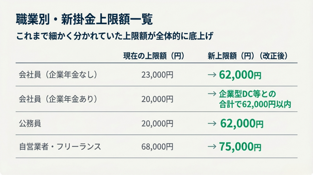 今回の改正で最も注目されているのが、毎月積み立てられる掛金上限額の引き上げです。これまで職業や勤務先の年金制度によって細かく分かれていた上限額が、全体的に底上げされます。