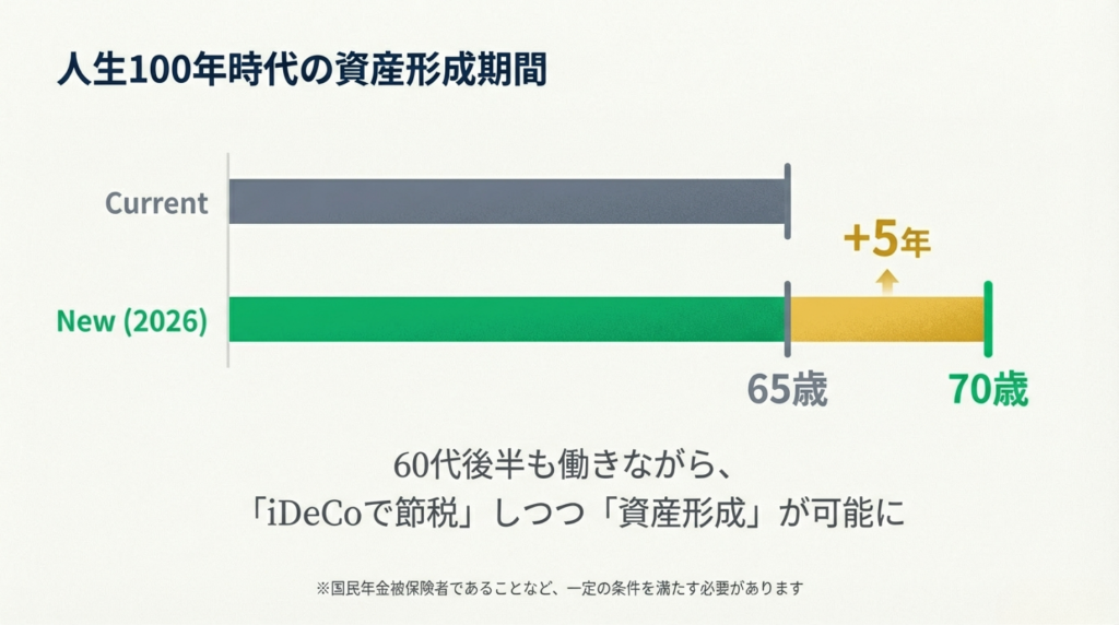 - 運用益の非課税期間が延びる: 加入年齢が70歳未満まで延びることで、運用益にかかる税金(通常約20%)が非課税になる期間を長く確保でき、複利効果を最大限に活かせます。