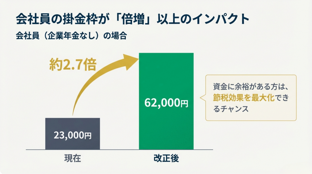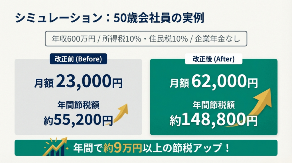 - 改正後の節税効果: 月62,000円に増額して12ヶ月 = 年間744,000円の拠出。 同じく税率20%とすると、年間約148,800円の節税に!