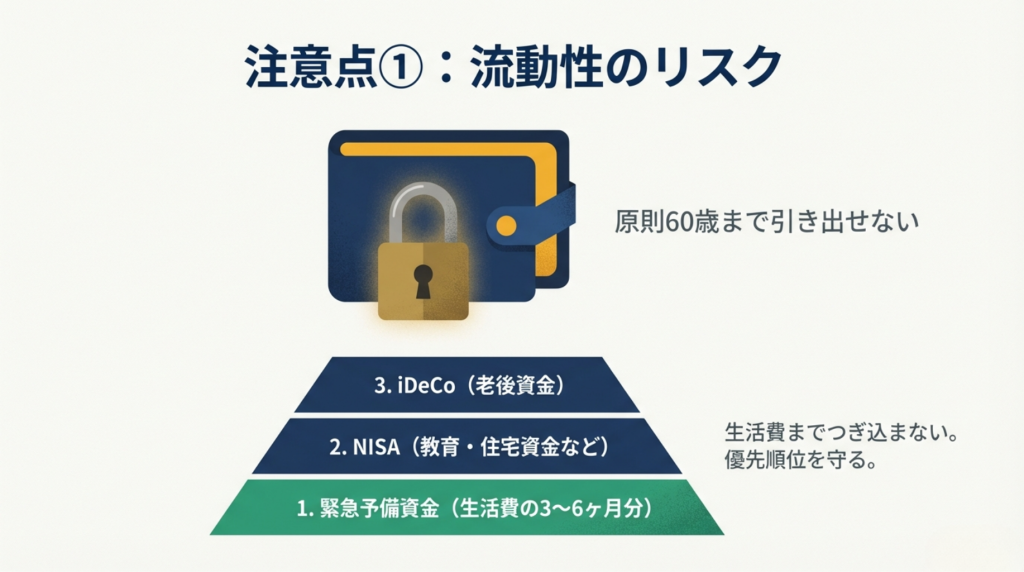 掛金上限が増えたからといって、無理をして生活費までつぎ込んでしまうと、急な出費に対応できなくなります。iDeCoの資金は原則60歳まで引き出せない点には引き続き注意が必要です。