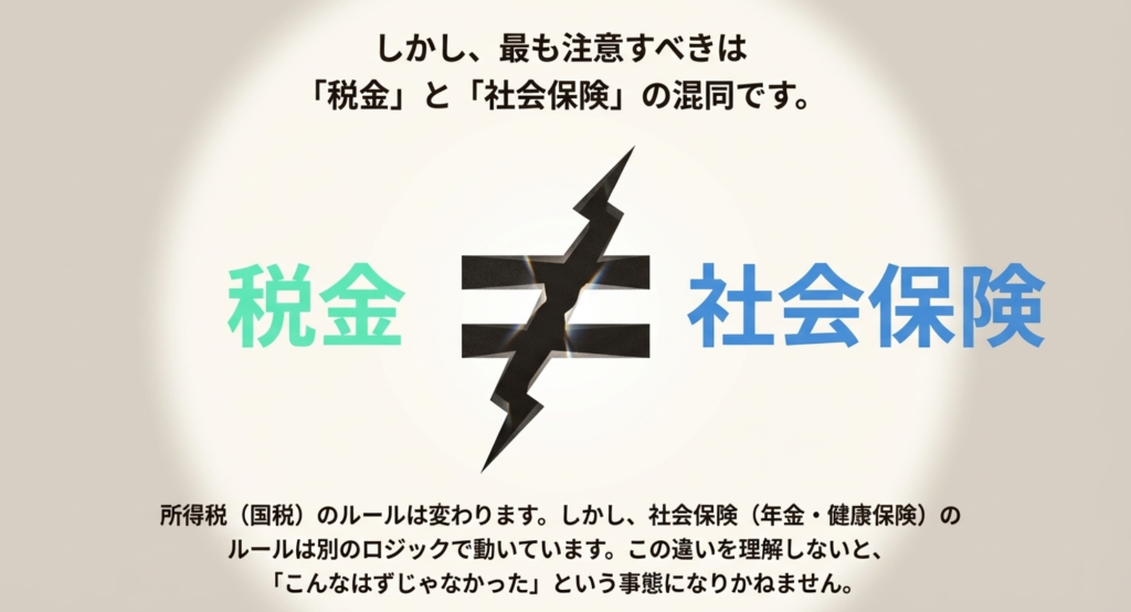 所得税(国税)のルールが変わっても、社会保険(厚生労働省管轄)のルールは別のロジックで動いています。