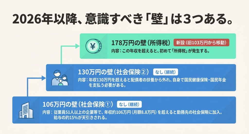 - ただし「社会保険の壁(106万/130万)」は残る。 ここを超えると手取りは約15%減るスタートになる。