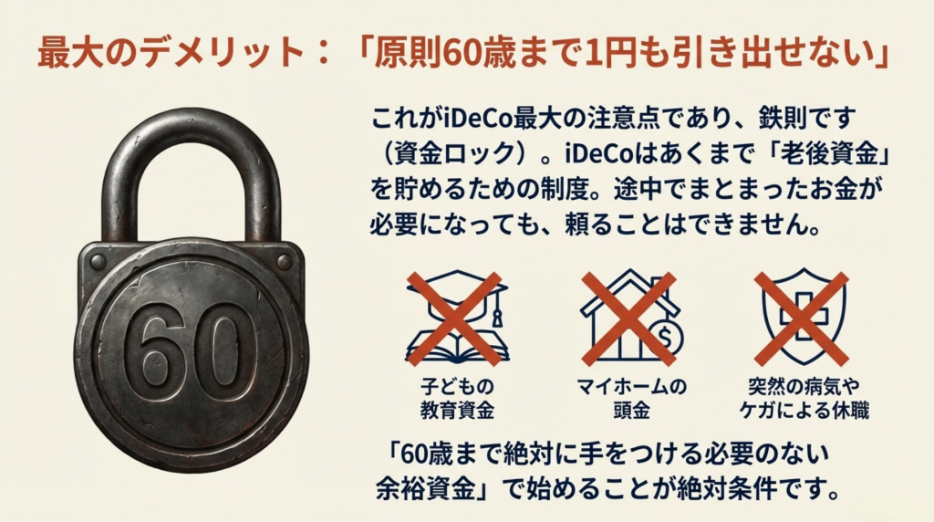 - 最大のデメリットは「60歳まで引き出せないこと」。