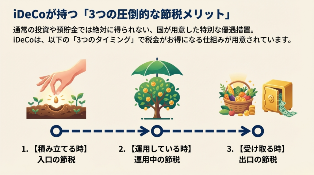 iDeCoには、大きく分けて「3つのタイミング」で税金がお得になる仕組みが用意されています。まずはここをしっかりと押さえましょう。