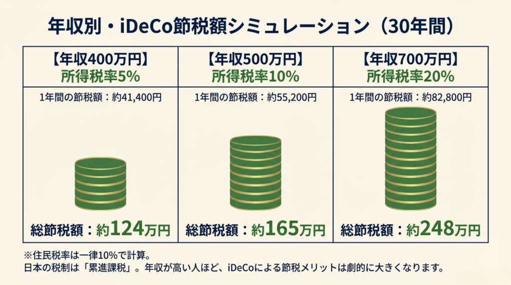 日本の税制は「累進課税(所得が多い人ほど税率が高くなる仕組み)」であるため、年収が高い人ほど、iDeCoによる節税メリットは大きくなります。